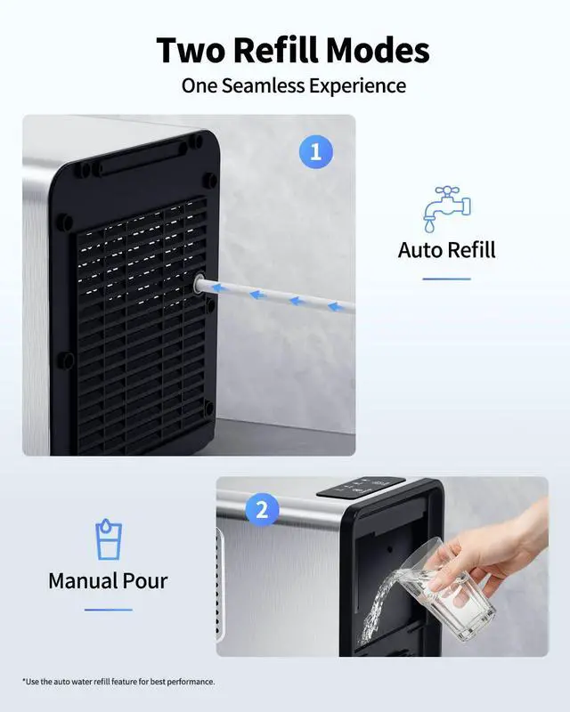 Auto Water Supply No Manual Refills Needed: With its built-in automatic water feed system, this ice machine refills itself as it worksno more stopping to pour water. Enjoy nonstop nugget ice from a convenient ice makers countertop design. Spend more time enjoying your drinks and less time refilling your ice cube maker.