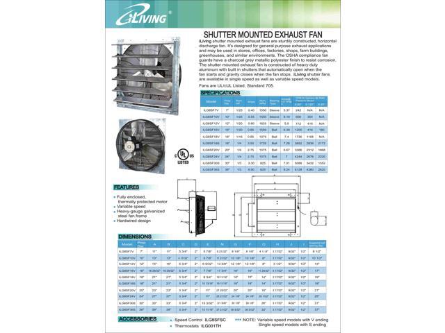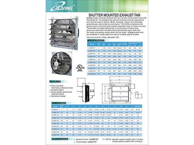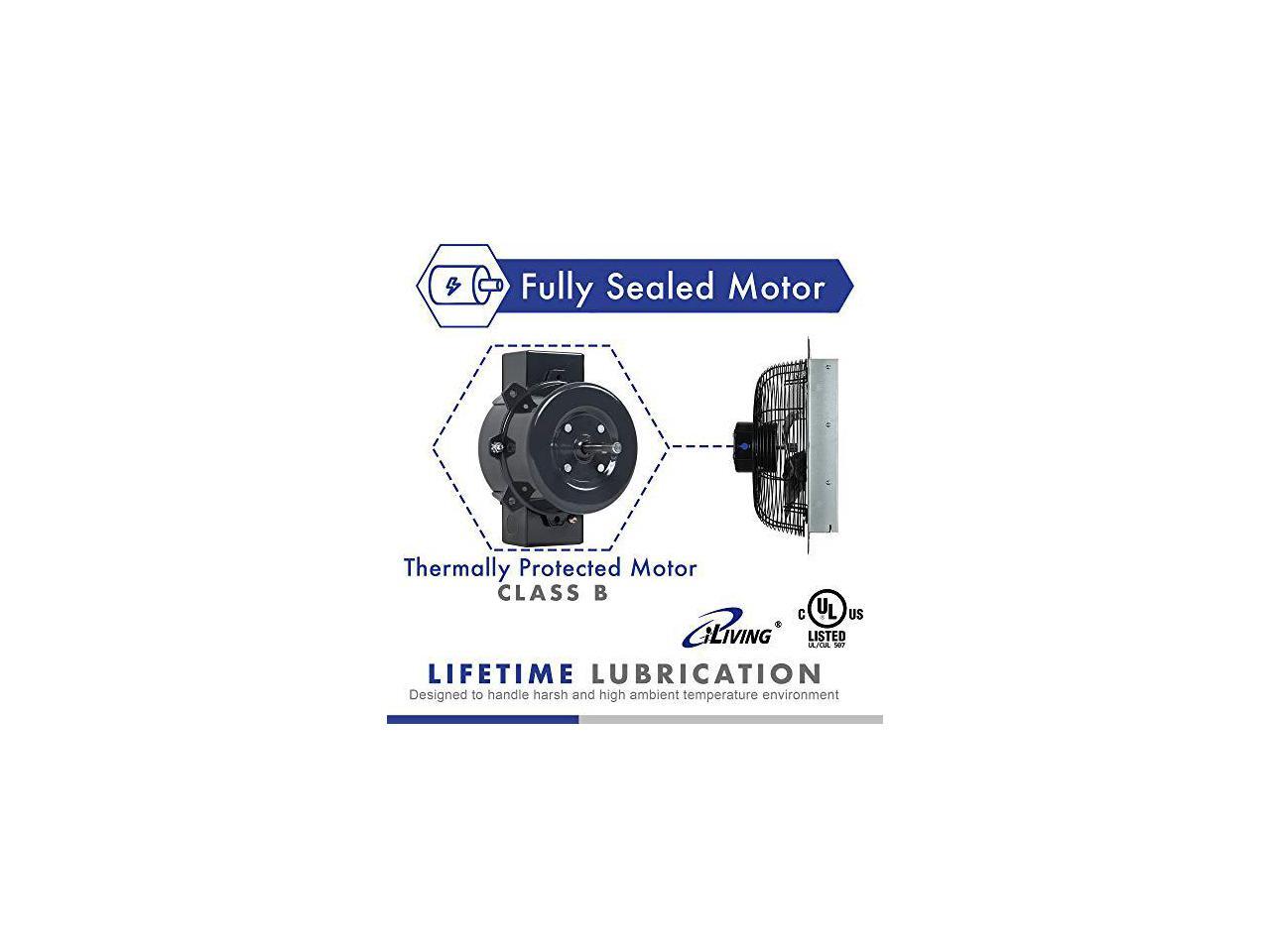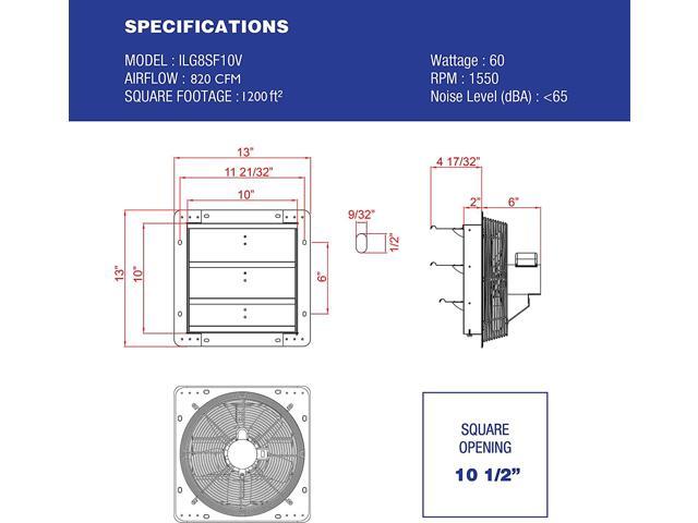 - POWERFUL AND EFFICIENT: Small but mighty, youll enjoy the power and efficiency of iLivings Shutter Exhaust Fan. The 10-inch runs onstandard 120 volts at 1/25 HP, 0. 55 amps with 1580