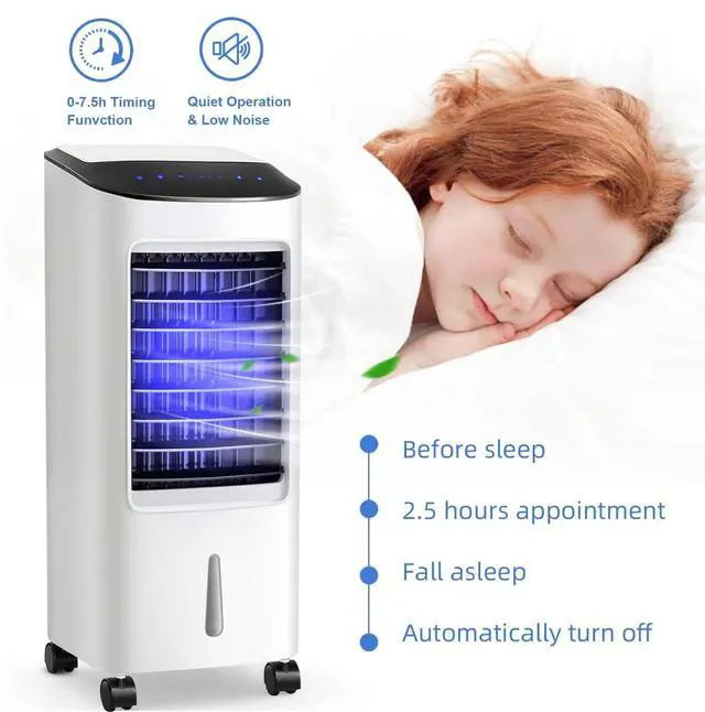 This multifunction portable air conditioner can blow the cool wind, keeps your skin moist, and supply fresh air while saving you money. The air conditioner produces no sounds, with the fan turning making no noise. This air cooler is a compact size machine with low energy consumption. Just add water on the side of the device to cool down. It is much cheaper and convenient than buying an air-conditioning unit. In addition, the humidifying function will make the air moist, making your skin healthier. Furthermore, thanks to its small size it is easy to carry and does not take up too much space. Three modes to choose from normal, natural, sleep3 speeds to meet your different needsThe 7L water tank can reduce the number of water additionsA visible window on the front side helps you see the water level conveniently and clearlyUniversal wheel and built-in handle for easy movementA touch panel is intuitive and easy to operateThe remote control allows you to remotely adjust the cooling temperature and other specificationsThe compact size makes it easy to move and carry around65W power, saving electricityReinforced tank for avoiding safety issuesHalf-detachable water tank with a water pump.Blinds can be adjusted automatically or manuallyThe special air supply design gives you an additional cool feel on hot summer days