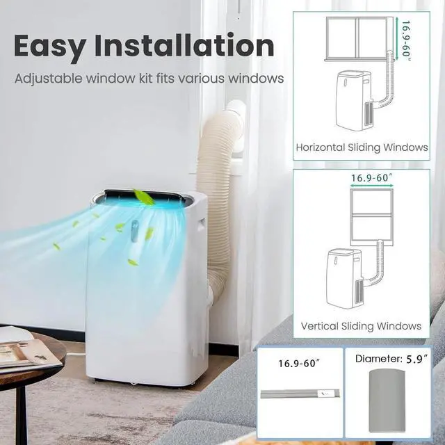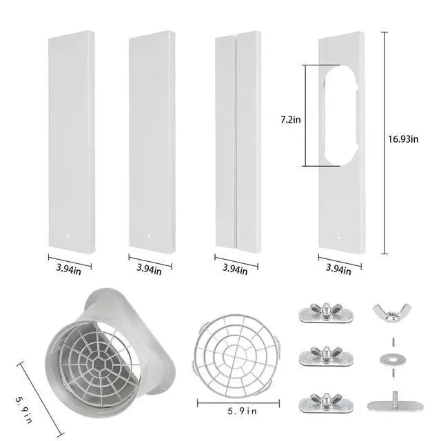 EASY INSTALLATION: In the first step, secure the panel with screws. Step 2 Rotate the coupler counterclockwise onto the hose and press down to secure the coupler to the panel. Step 3 Rotate the hose counterclockwise onto the machine's coupler. Finally, place the mounted panel between the sliding windows and adjust the length to fit the height of the windows, the extension length ranges from 17 inches to 60 inches.
