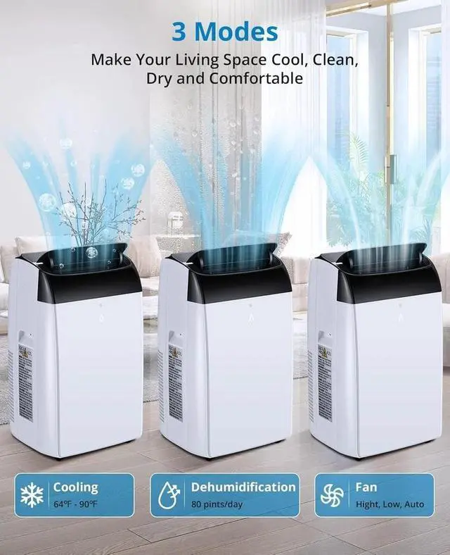 3-in-1 The smart portable air conditioner offers the convenience of 3-in-1 functions, including Cooling, 3-speeds Fan, and Dehumidify,You can freely adjust the temperature in cooling mode, ranging from (64 to 90) in hot seasons. which meets your daily needs.The dehumidifier capacity can effectively reduce the humidity in small room, and as a fan to circulate indoor air at all times, removing excess moisture and releasing fresh air for a healthy and comfortable