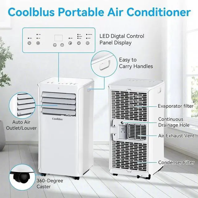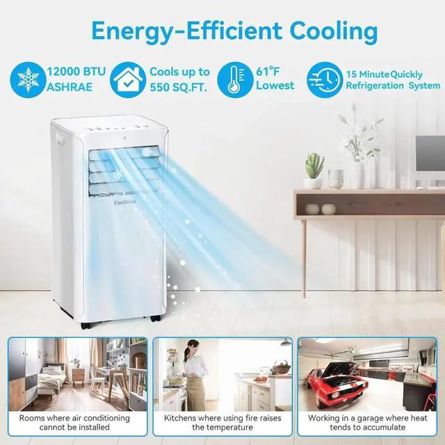 Elevate your comfort with our 3-in-1 portable air conditioner (7100 BTU DOE / 12000 BTU ASHRAE). It cools, dehumidifies, and functions as a fan with adjustable speed and auto air swing,cooling to 61-88°F at the setting