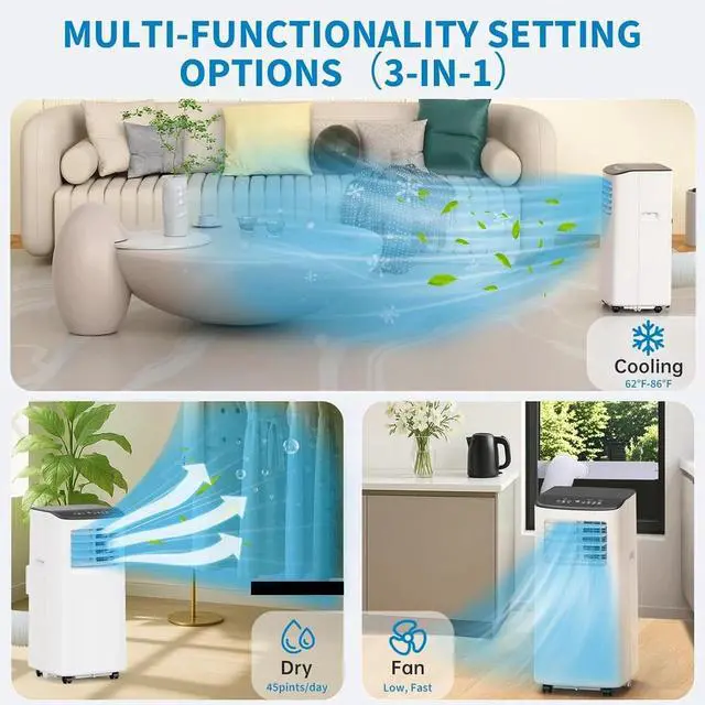 3 in-1 Ac Unit: With 3 modes, Cooling, Dehumidifying and Fan, this room air conditioner makes it easier to achieve your ideal setting. You can set the Cool mode, utilize the Dry mode for dehumidification at a rate of 45 pt per day, and choose wind speed in Fan mode to suit your needs