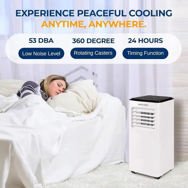 ENERGY EFFICIENT AC - Designed for energy efficiency with low power consumption. This portable air conditioner operates with a low noise level (53 dBA) as it has a wrapped motor. Control the settings conveniently with the included remote control
