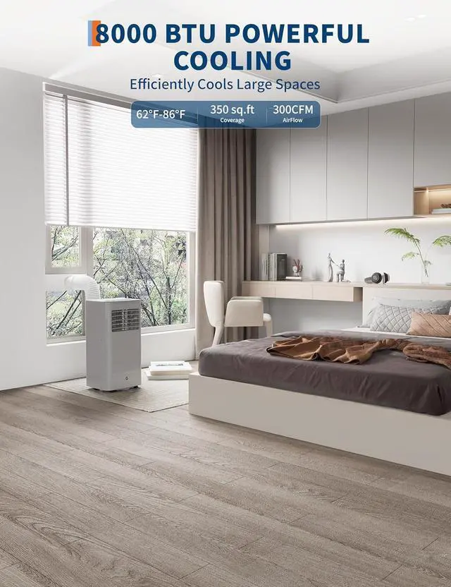 Powerful Cooling Performance: This 8,000 BTU portable air conditioner is equipped with an advanced cooling engine, delivering rapid and efficient cooling. It can effectively cool spaces up to 350 sq. ft, providing instant relief from the heat and ensuring a comfortable environment in bedrooms, offices, and apartments