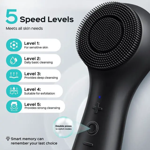 The silicone facial scrubber is suitable for all skin types, containing sensitive skin, oily skin, dry skin and combination skin. The facial brush also has a five-speed adjustment function, so users can adjust it according to different skin needs