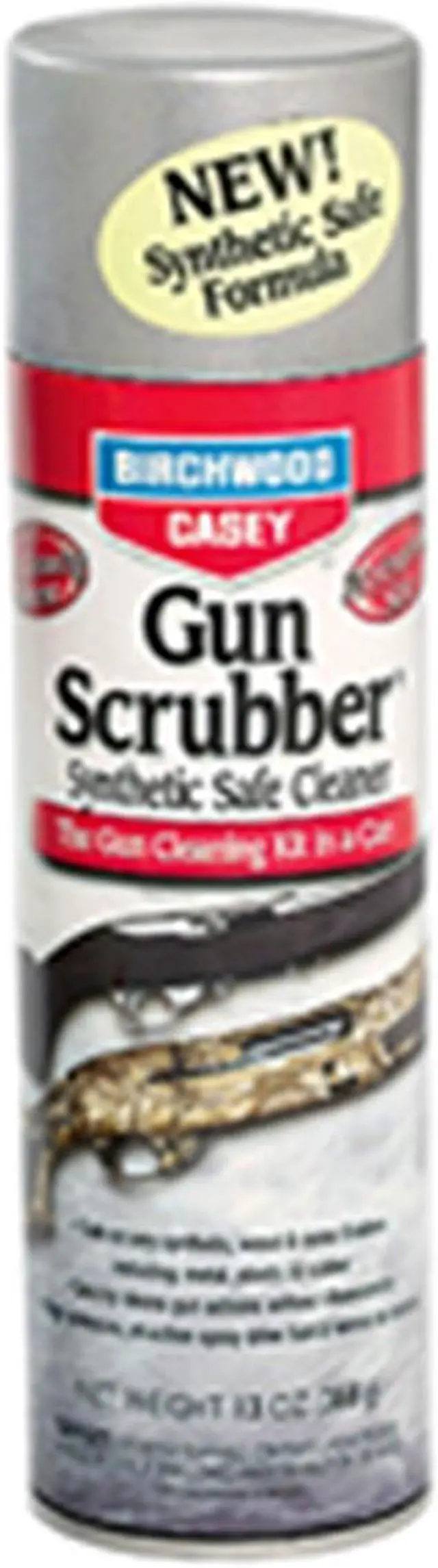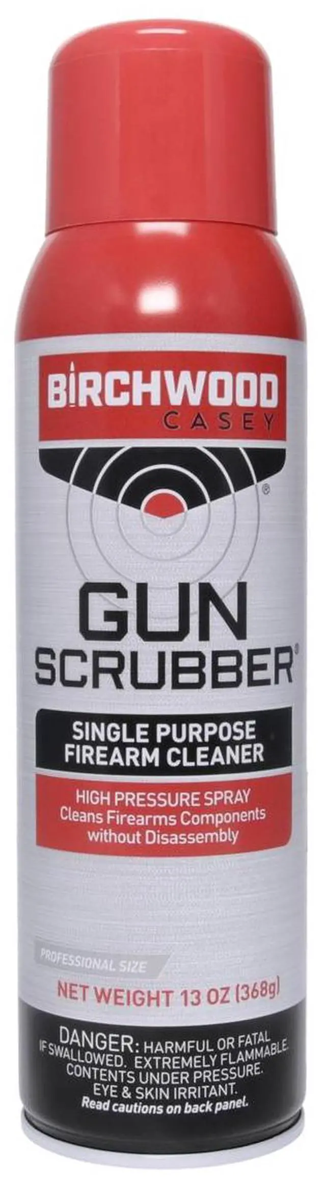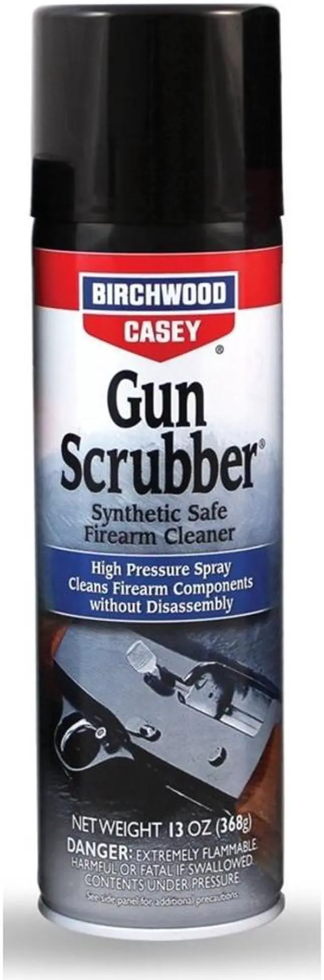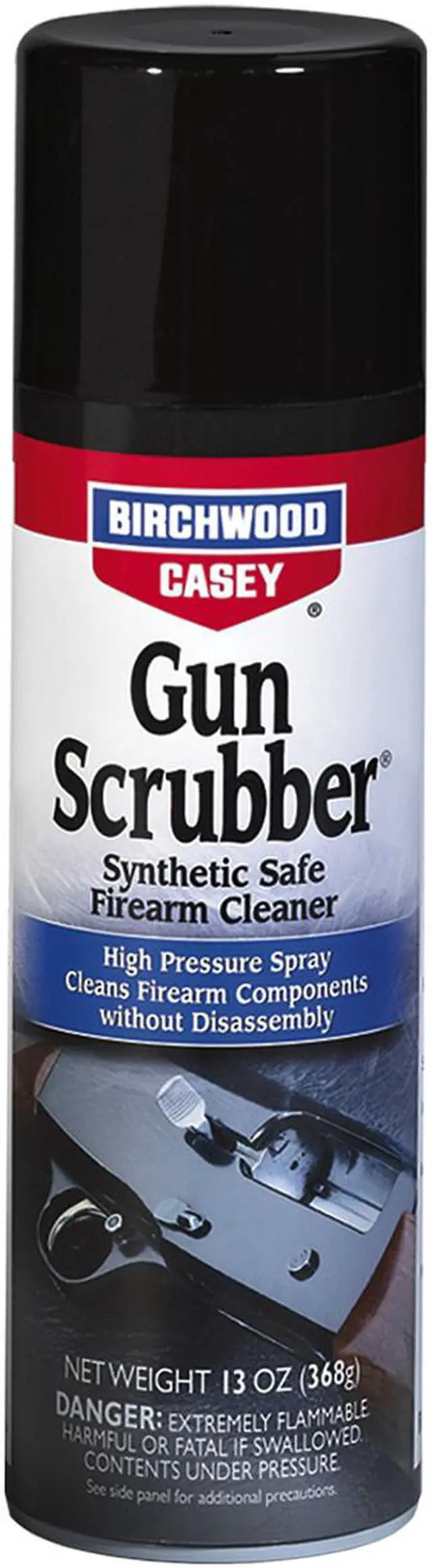 BIRCHWOOD CASEY 33344 BIRCHWOOD CASEY GUN SCRUBBER FIREARM CLEANER 13OZBW Casey Gun Scrubber Firearm Cleaner 13oz. Gun Scrubber Firearm Cleaner. 10 oz. Aerosol spray. Solvent/degreaser. Will not harm plastic, wood, laminates, composites, rubber grips or any other material used in guns (including camo finishes) 13 oz. Aerosol sprayWill not harm plastic, wood, laminates, composites, rubber grips or any other material used in gunsGun Scrubber Firearm Cleaner123