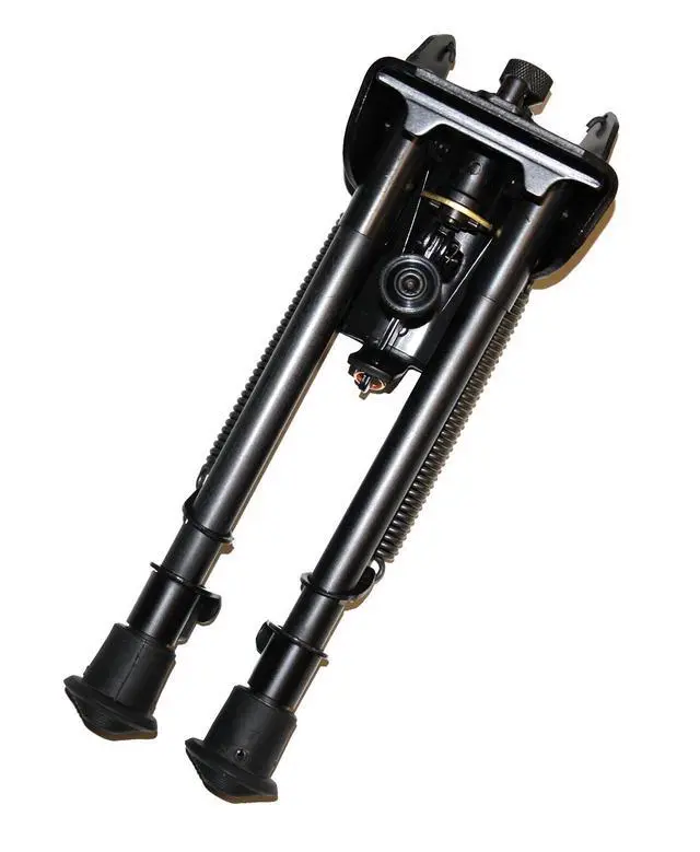 Ultra-light Harris Bipods are lightning quick and manufactured with quality heat treated steel and hard alloys. The bipods are quick-detachableand clamp to the Q. D. stud of bolt action rifles with conventional stock design. Carrying your rifle with a sling or shooting off-hand is not impeded by the use of a Harris Bipod. Bipods have an all-weather black anodized finish. Adjustable legs extend from 9" to 13" with leg notches.
