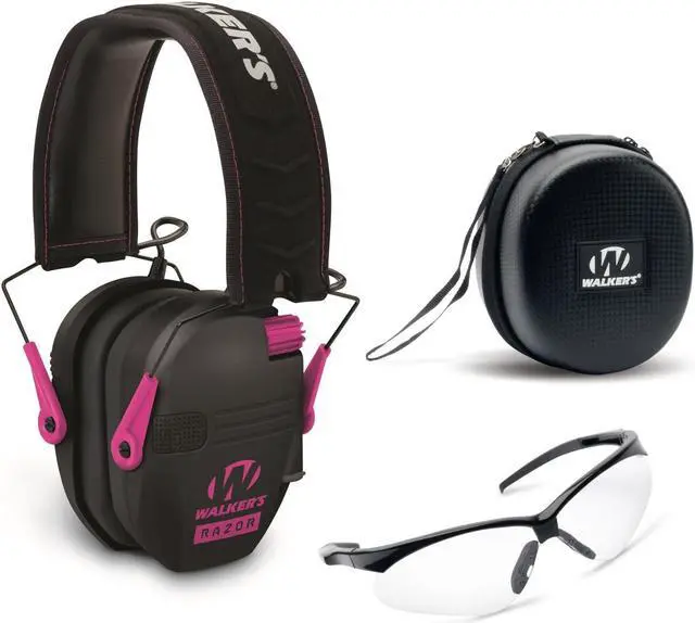 Walker’s Razor Slim Electronic Muff (Black/ Pink) with Case and Shooting Glasses