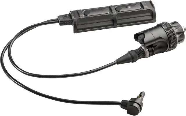 Operate your SureFire Scout Light weapon light and an aiming laser device without having to move your hands from firing position with this black DS-SR07-D-IT Remote Switch Assembly. Attached to the back of the Scout Light, the assembly offers two options for using the lightthe built-in push-button on/off switch, and the pressure switch with 7" cable, which mounts on a Picatinny rail and which controls the light on a momentary basis. The pressure switch also controls an ATPIAL (Advanced Target Pointer/Illuminator/Aiming Laser) or DBAL (Dual Beam Aiming Laser); a second cable plugs into the laser device.
