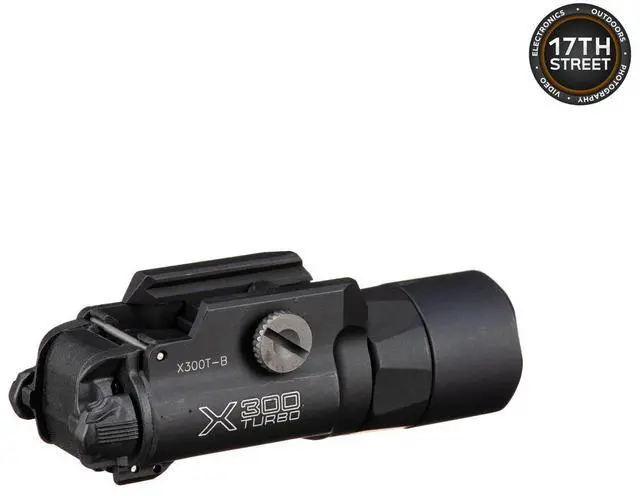 The SureFire X300T-B Turbo Tactical Light delivers 650 lumens of intense white light with a peak beam intensity of 66,000 candela, providing a tightly focused beam for precise target identification at extended distances. Its ambidextrous switching allows for both momentary and constant-on activation, catering to various operational needs. The attachment system permits secure and rapid attachment to Universal and Picatinny accessory rails, ensuring compatibility with a wide range of devices. Built from aerospace aluminum with a Mil-Spec hard anodized finish and rated IPX7 waterproof, the X300T-B is designed to withstand harsh environments, making it a reliable choice for professionals.
