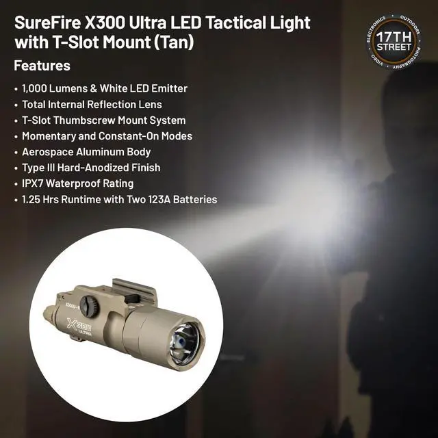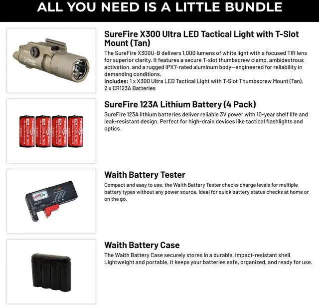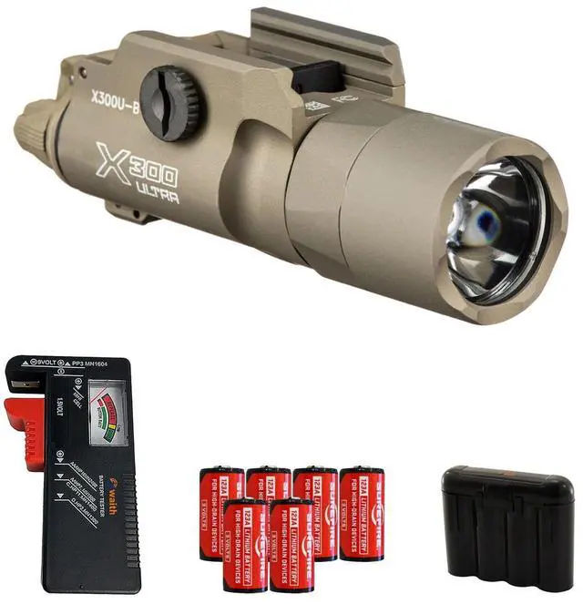 - Bundle Includes: 1 x SureFire X300 Ultra LED Tactical Light (T-Slot Mount, Tan), 6 x CR123A Batteries, 1 x Waith Battery Tester Checker, 1 x Waith CR123A Black Battery Holder Storage Cases