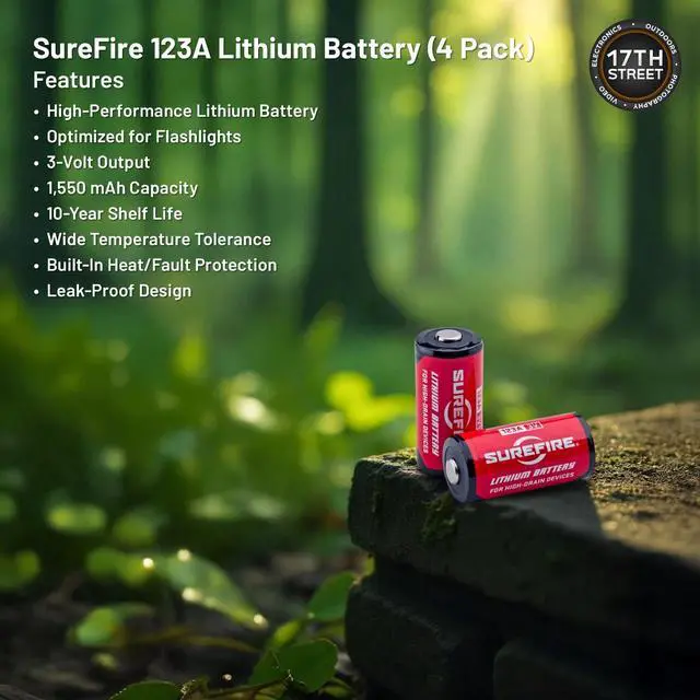 - SureFire 123A Lithium Batteries (4 Pack): Power high-drain devices with confidence using these high-performance 3V lithium batteries. With a 10-year shelf life, leak-resistant design, and reliable output, they’re a dependable energy source for flashlights, cameras, and other essential electronics.