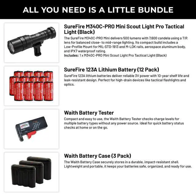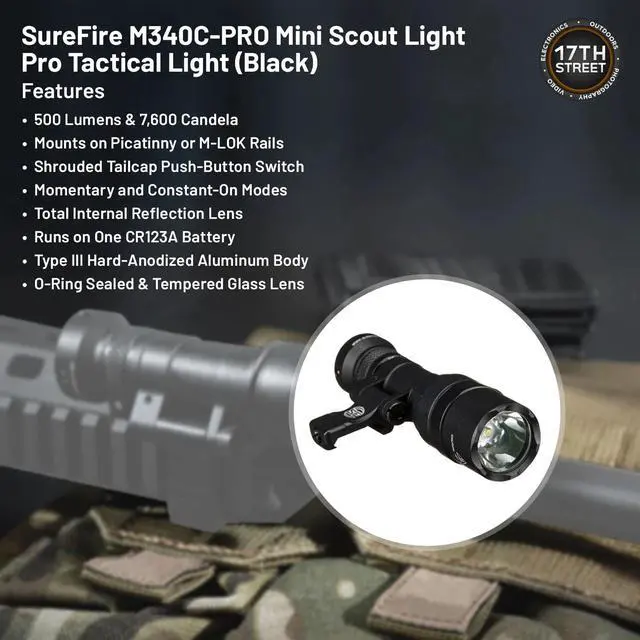 The SureFire M340C-PRO Mini Scout Light Pro delivers 500 lumens of bright white light with a peak beam intensity of 7,600 candela, providing a versatile beam suitable for close- to medium-range engagements. Its Low-Profile Mount (LPM) offers flexible positioning on MIL-STD-1913 and M-LOK rails, ensuring compatibility with various configurations. The Total Internal Reflection (TIR) lens focuses the light into a high-intensity hybrid beam, enhancing situational awareness. Constructed from aerospace aluminum with a Mil-Spec hard-anodized finish, the M340C-PRO is built for durability and combat readiness. With an IPX7 waterproof rating, it ensures reliable performance in challenging conditions.