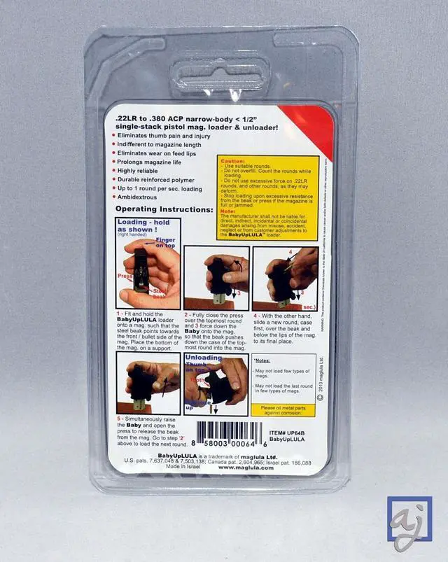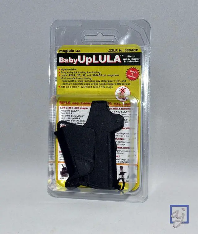 The BabyUpLULA is a high-quality pistol magazine loader and unloader designed for loading virtually all*. 22 LR to. 380 ACP (9mm Short/Kurz) single-stack narrow-body 1/2" mags. which have normal / moderate angle of lips. It does so easily, reliably, and painlessly.