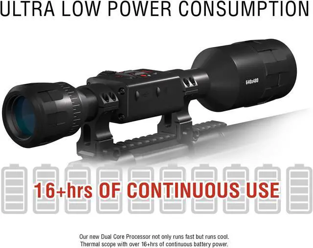 Enhanced shooting performance on targets hidden in plain sight with a Thermal 60 Hz refresh rate Sensor. Thermal imaging zoom available from 1.25-5x to 4-40x magnification range and furnished with Black Hot/ White Hot/ Color viewing modes. Fortified with Obsidian Dual-Core Processor for enhanced thermal sensitivity and higher resolution images with sharp contrast and crisp clarity. A built-in Ballistics Calculator that instantly gives you POI correction, while Video recording with recoil activation stores your hunting moments on a Micro SD card of up to 64Gb. The industry-leading power management system provides a battery life of 16+ hrs. Plus, a comfortable 3" eye relief and multiple reticles to choose from.