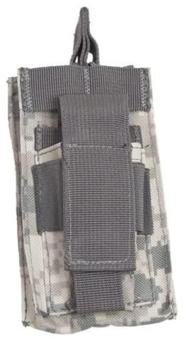 The single AR and a single pistol magazine pouch is designed to hold both an AR type magazine and a semi auto pistol magazine in a convenient compact design. The magazine pouch features an adjustable bungee cord with a pull tab for the rifle magazine and an adjustable hook and loop magazine flap for the pistol magazine to secure each of the magazines in the pouch. The rear of the pouch features PALS straps with metal button snaps for mounting the magazine pouch to any MOLLE compatible gear.
