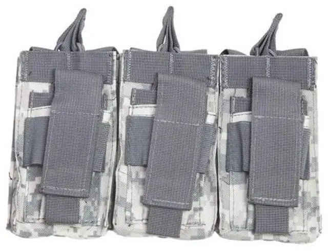 The triple AR and a triple pistol magazine pouch is designed to hold three AR type magazines and three semi auto pistol magazines. The magazine pouch features an adjustable bungee cords with a pull tabs for the rifle magazines and an adjustable hook and loop magazine flaps for the pistol magazines to secure each of the magazines in the pouch. The rear of the pouch features PALS straps with metal button snaps for mounting the magazine pouch to any MOLLE compatible gear.