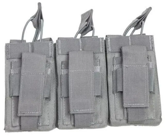 The triple AR and a triple pistol magazine pouch is designed to hold three AR type magazines and three semi auto pistol magazines. The magazine pouch features an adjustable bungee cords with a pull tabs for the rifle magazines and an adjustable hook and loop magazine flaps for the pistol magazines to secure each of the magazines in the pouch. The rear of the pouch features PALS straps with metal button snaps for mounting the magazine pouch to any MOLLE compatible gear.