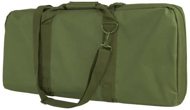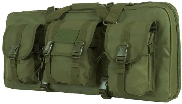 Deluxe Double Pistol Carbine 28 case allows for 2 AR & AK pistols, subguns, or folding carbines to be transported within the padded main compartment with a padded divider to prevent weapons from contacting each other. There are three external storage pouches to store mags or other shooting gear. The external pouches closes securely with quick connect buckles and hook and loop fasteners. On the outside of the double pistol carbine case features four compression straps with quick connect buckles for securing gear in place, heavy duty carry handle straps, and an adjustable shoulder strap.