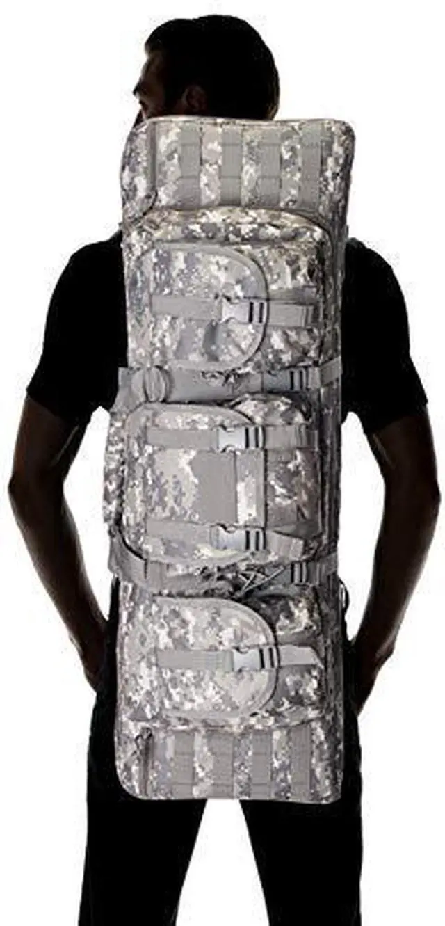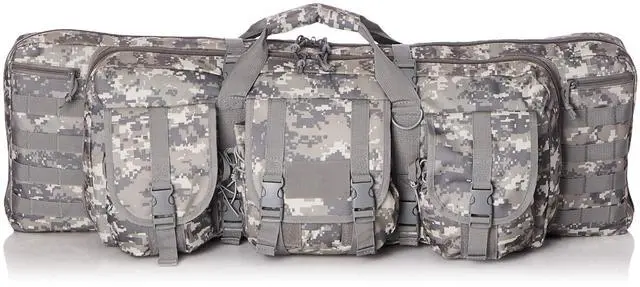 Double Carbine Case 55" case allows for 2 Rifles, Carbines, or Shotguns to be transported within the padded main compartment with a padded center divider to prevent weapons from contacting each other. With a large secondary zippered compartment with padded internal compartments with hook and loop enclosures to store a couple handguns and other essential shooting gear. There are three external storage pouches to store mags or other shooting gear. The external pouches closes securely with quick connect buckles and hook and loop fasteners. On the outside of the double carbine case features MOLLE webbing for attaching other MOLLE compatible gear, four compression straps with quick connect buckles for securing gear in place, two small side zippered compartments, heavy duty carry handle straps, and padded backpack style shoulder straps.