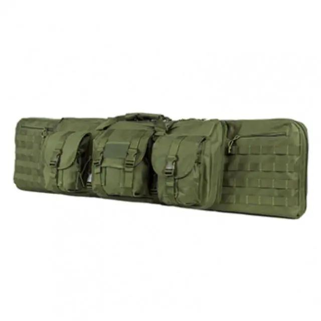 Double Carbine Case 52" case allows for 2 Rifles, Carbines, or Shotguns to be transported within the padded main compartment with a padded center divider to prevent weapons from contacting each other. With a large secondary zippered compartment with padded internal compartments with hook and loop enclosures to store a couple handguns and other essential shooting gear. There are three external storage pouches to store mags or other shooting gear. The external pouches closes securely with quick connect buckles and hook and loop fasteners. On the outside of the double carbine case features MOLLE webbing for attaching other MOLLE compatible gear, four compression straps with quick connect buckles for securing gear in place, two small side zippered compartments, heavy duty carry handle straps, and padded backpack style shoulder straps.