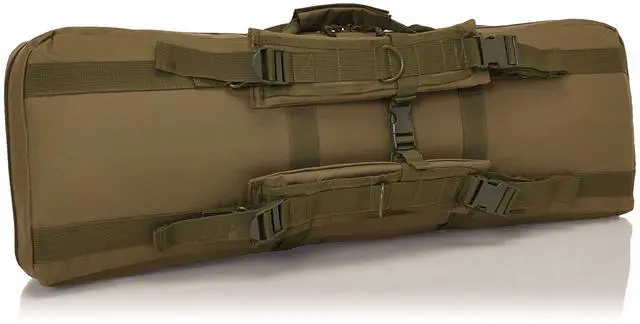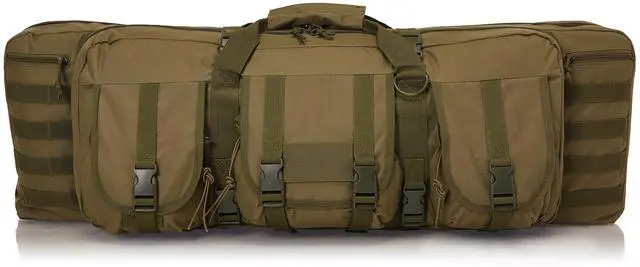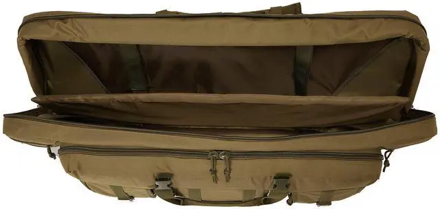 Double Carbine Case 55" case allows for 2 Rifles, Carbines, or Shotguns to be transported within the padded main compartment with a padded center divider to prevent weapons from contacting each other. With a large secondary zippered compartment with padded internal compartments with hook and loop enclosures to store a couple handguns and other essential shooting gear. There are three external storage pouches to store mags or other shooting gear. The external pouches closes securely with quick connect buckles and hook and loop fasteners. On the outside of the double carbine case features MOLLE webbing for attaching other MOLLE compatible gear, four compression straps with quick connect buckles for securing gear in place, two small side zippered compartments, heavy duty carry handle straps, and padded backpack style shoulder straps.
