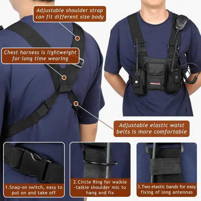 Merchant VideoRadio chest harness can fit most walkie talkie and hole onne Ham,Police,Fire,Marine,VHF,UHF,FRS,Walkie Talkie,Portable Radios,or GPS Scanner and EDC Tools,Energy Bars, Phone,Etc.