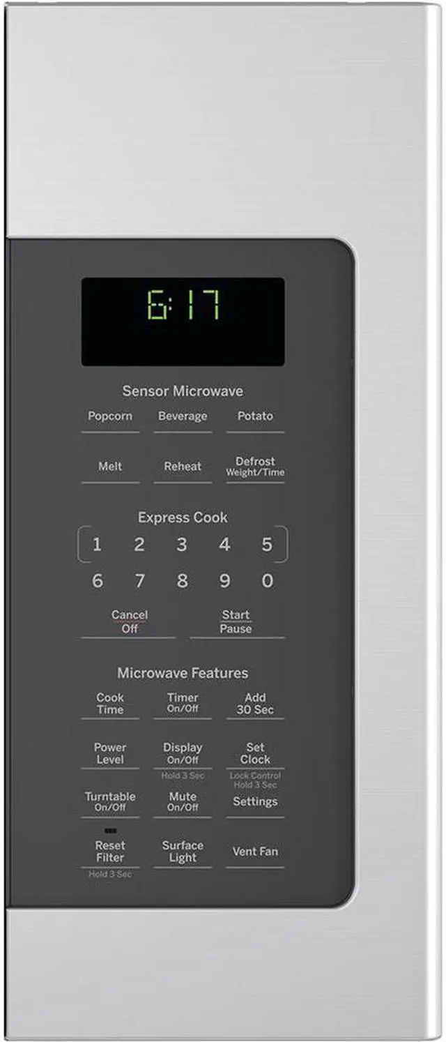 Sensor cooking controls 1.7 cu. ft. capacity Auto and time defrost Recessed turntable with on/off Two-speed, 300-CFM venting system Removable two-position oven rack