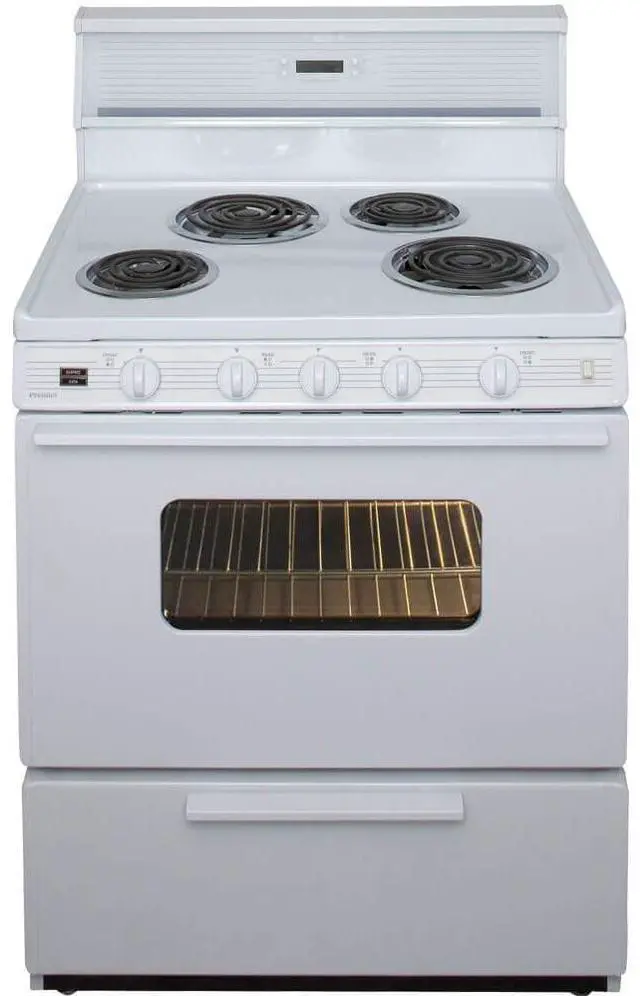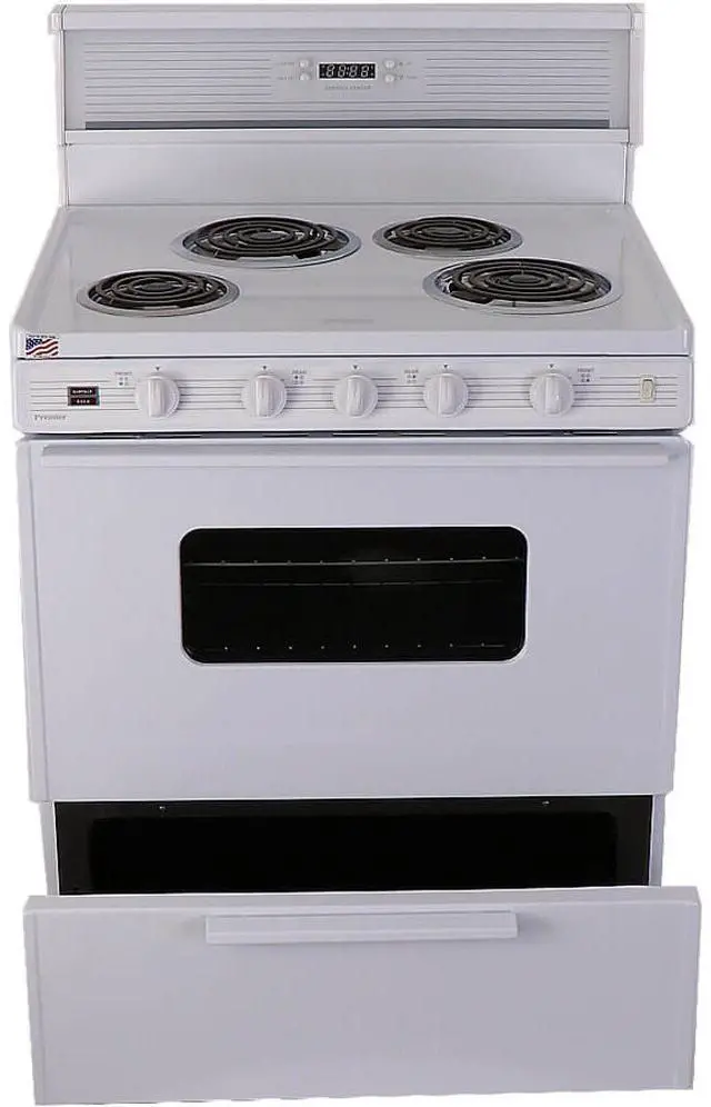 Front controls, two 8 In. and two 6 In. top burner elements, 2 heavy duty oven racks, a full 25 In. wide oven, a full width storage drawer, windowed door, oven light and electronic clock/timer makes this a most desirable range in any modern kitchen. Additional Information