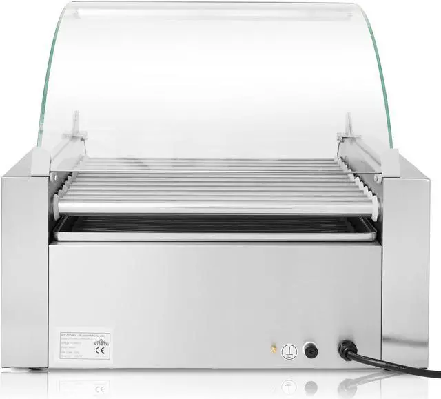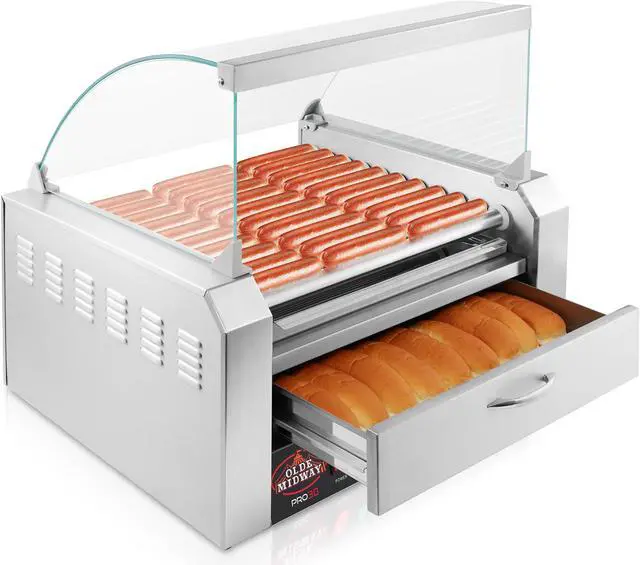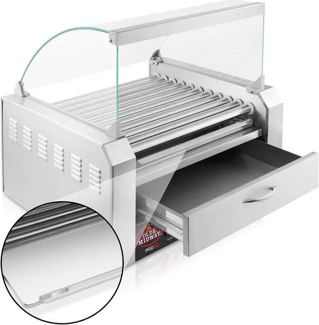 Olde Midway's electric hot dog roller machine with bun warmer and glass cover makes it easy to prepare mouth-watering rotisserie style hot dogs. Cook up to 30 hot dogs at once on the 11 stainless steel rollers.