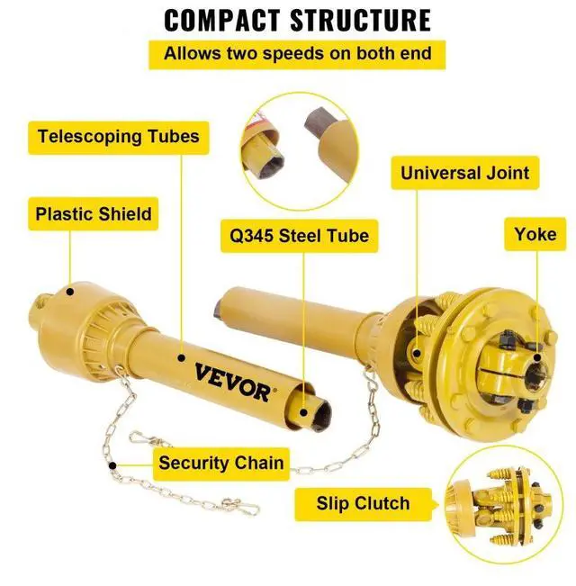 Vevor Pto Shaft Pto Drive Shaft 1-3/8"x6 Spline W/slip Clutch Yellow T4 31.5 -41"Heavy-Duty PTO Shaft1-3/8" Connection Ends 31.5" -41" Stretchable LengthCompact Transmit StructureSimple & Quick InstallationWide