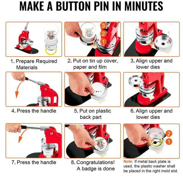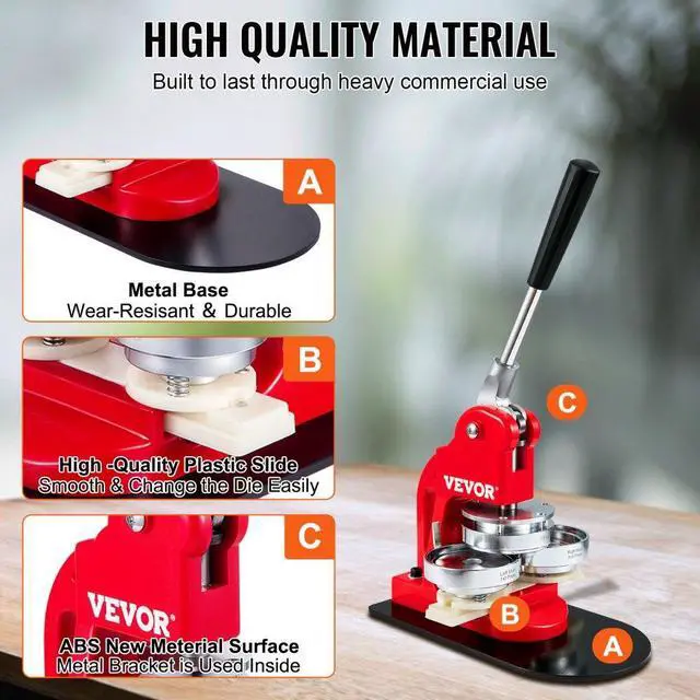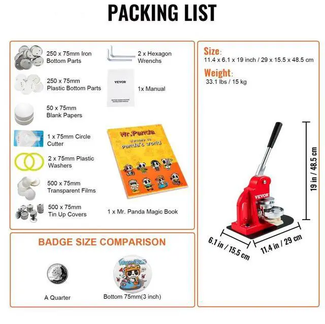 • VEVOR Button Maker Machine Badge Pin Machine 3" 75MM 500 Free Parts Press KitMr. Panda Magic BookPremium Iron MaterialWell-Designed DetailsOperation Way: Manual,Die Diameter: 3 inch/ 75 mm,Size: 11.4 x 6.1 x 19 inch/ 29 x 15.5 x 48.5 cm,Model: BJS-75-RD-01,Material: Iron & ABS,Weight: 34.2 lbs/ 15.5 kg