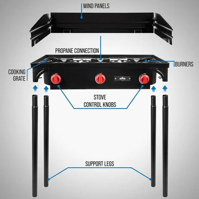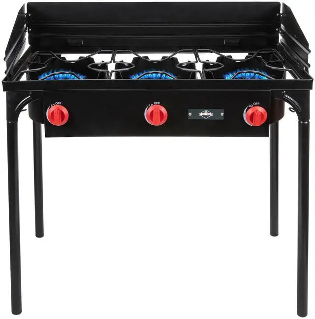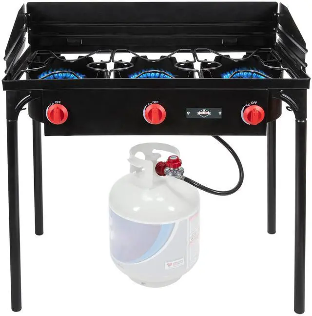 Bring the power and dependability of your kitchen cooktop to camp with the Outdoor Triple Burner Stove from Hike Crew. This high-powered camping stove features a spacious range with real cast-iron burners for quick, consistent output up to 225,000 BTUs. Just hook to any standard 20 lb. propane tank via the provided PSI regulator and hose to grill, fry, boil, simmer, and sauté a variety of culinary creations. The frame’s lightweight design and removable legs are perfect for on-the-go chefs, while the top’s integrated wind panels make cooking a breeze—no matter the weather. And when you’re ready to hit the road, the entire unit compactly stows inside the bonus Hike Crew carrying case. From pancakes, bacon, and eggs to steaks, burgers, and dogs, alfresco cooking has never been safer or more satisfying. Add an Outdoor Triple Burner Stove to your cart today!