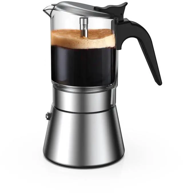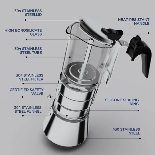 Borosilicate Glass & Stainless Steel:The crystal clear glass made of high borosilicate glass allows you to check the espresso coffee situation that you could control the espresso coffee better. 304 food-grade stainless steel could make our Moka pot more healthy.