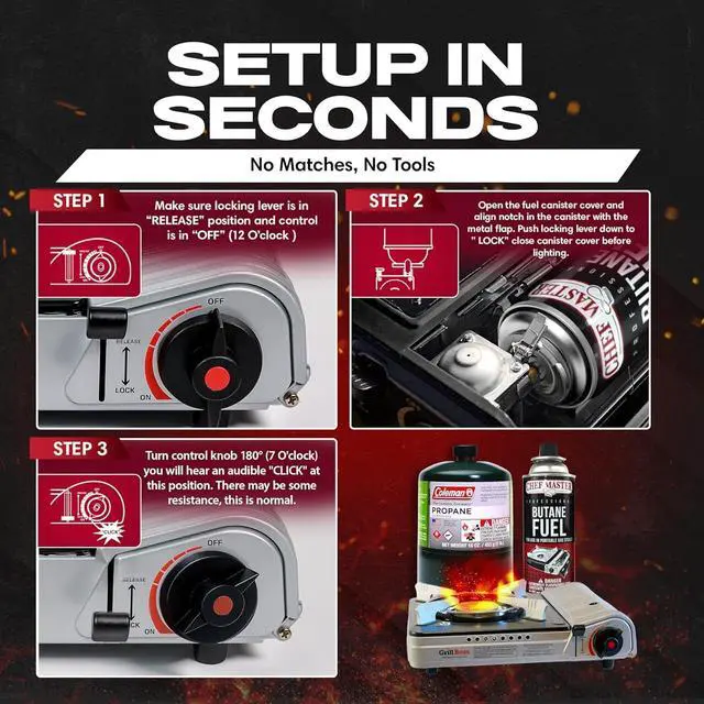 Process: Ensure fuel tin is locked in place correctly, THEN lock the tin by lowering the locking lever, THEN turn dial until you hear "CLICK". To light the stove, ensure that you turn the lighter knob all the way, anti-clockwise, PAST the point of first resistance, until you hear a loud CLICK.