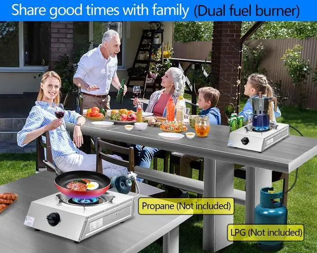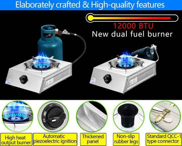 1: High heat output The 12000BTU heat food and water quickly. 2: Excellent workmanship Propane stove uses high-quality materials,No burrs ,Will not cut fingers. 3: 5FT LPG hose &1 LB Propane Converter Regulator he two connectors are worth $40.CSA group.Very money saving.