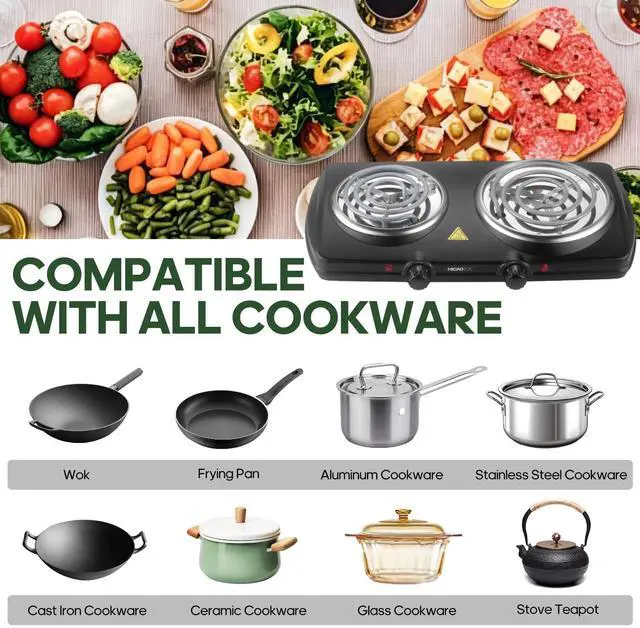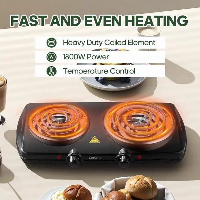 FAST, EVEN HEATING & DURABLE CONSTRUCTIONExperience quick meal prep with the powerful 1800W hot plate that heats up rapidly. The durable coil heating element ensures even temperature distribution across the entire cooking surface, preventing hot spots. Built with a sturdy steel housing, this hot plate electric is made to last through years of daily use.