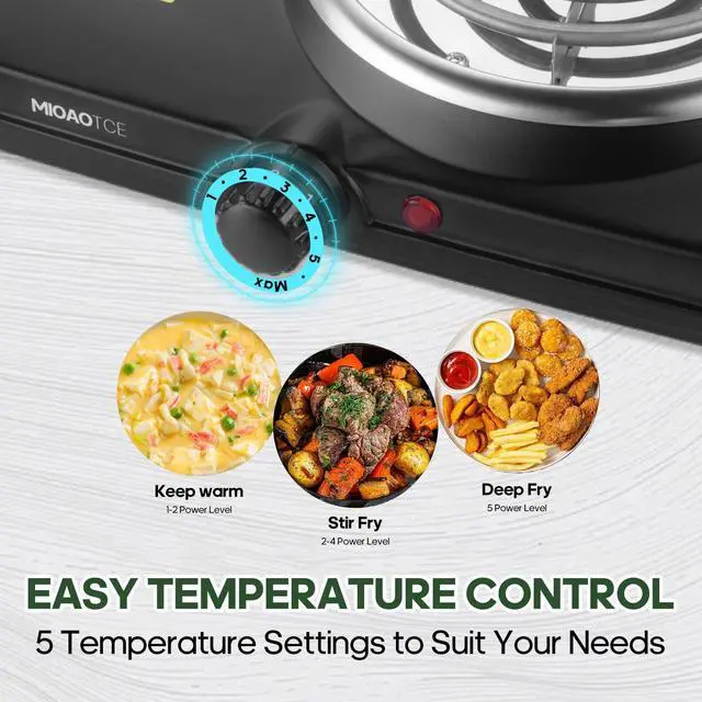 PRECISE 5-LEVEL TEMPERATURE CONTROLAchieve perfect cooking results every time. Simply turn the knob to choose from 5 precise temperature settings, ideal for simmering, frying, or boiling. The clear heating indicator light lets you know exactly when the electric burner is on and heating up, giving you full visual control.