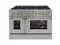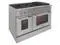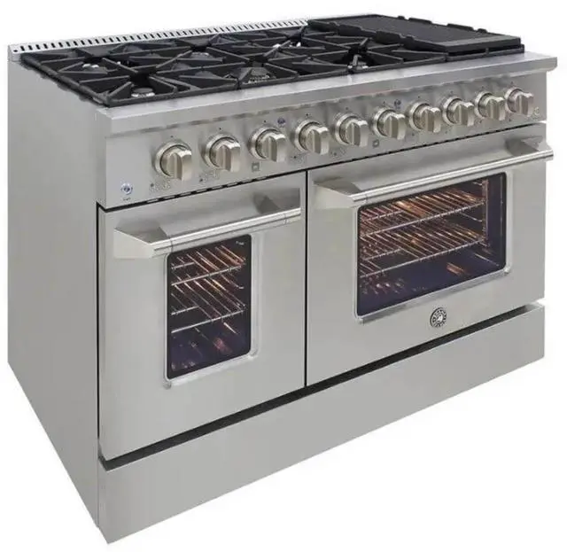 The BR-48SSGG 48" Freestanding Gas Range by Brama comes with 8 sealed burners and also features a 5.5 cu. ft. dual oven total capacity, cast iron cooking grates, blue porcelain oven interior, oven convection fan, and high-quality stainless steel control panel and knobs.