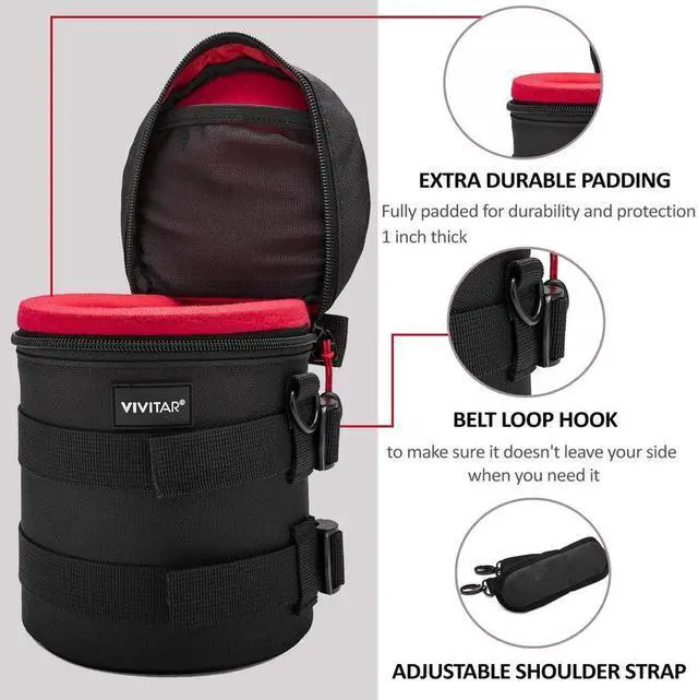 It features a built-in mesh pocket to store any accessories. Fully padded for durability and protection Belt loop hook to make sure it doesn't leave your side Adjustable shoulder strap Heavy duty lens case Built-in mesh pocket to store any accessories