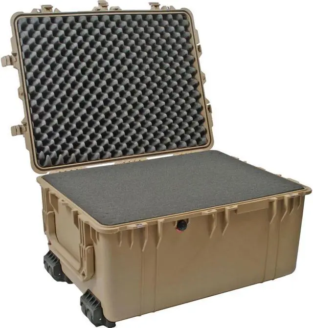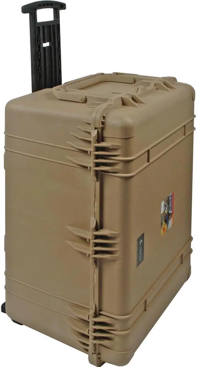 Because safeguarding your valuable equipment is paramount, the Pelican 1630 Watertight Hard Case with Cubed Foam Interior & 4 Wheels in a stylish Desert Tan color is your ultimate protective solution. This rugged, durable case is meticulously crafted from impact-resistant material, ensuring your delicate items such as electronics, camera equipment, or other valuables are shielded from potential harm.