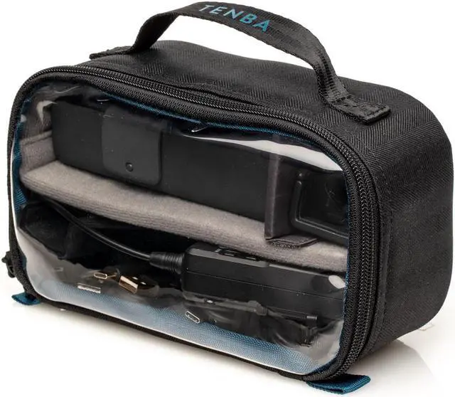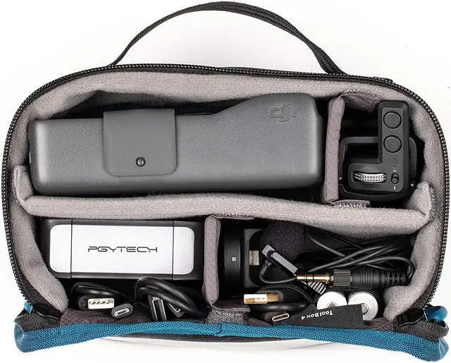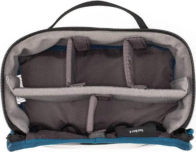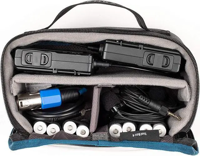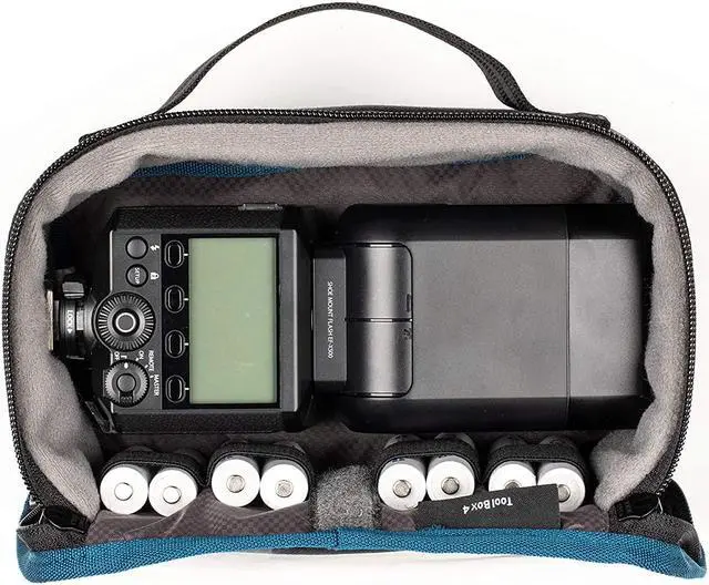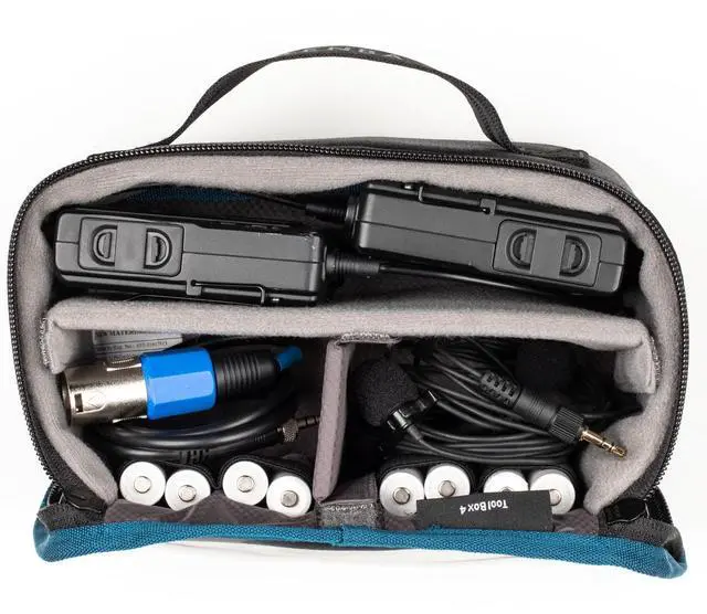 The toolbox features elastic loops that securely hold batteries and cables, preventing them from moving around during transport. The interior of the toolbox is more padded and rigid than a standard cable pouch, providing additional protection for your equipment.