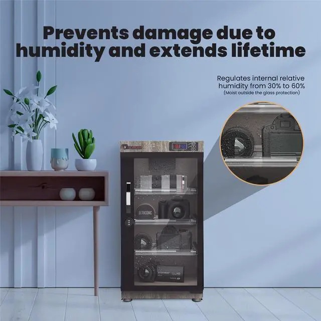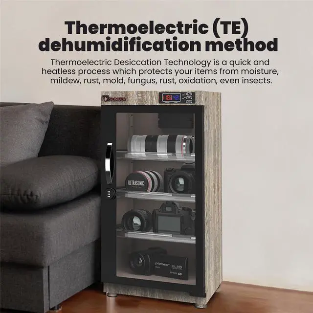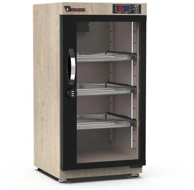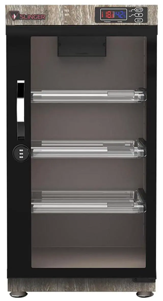 Extend life and maintain performance of your photo and video equipment using the Slinger Electronic Dry Cabinet with Oak Finish 55L. This programmable, moisture-sealed chamber stores up to 55L of gear, allowing you to create an ideal, low-humidity storage environment for your investments by actively drying up the air inside of its chamber. A combination lock keeps it all secure. It will help prevent corrosion, deterioration, and the growth of pesky fungi. To achieve this goal, the cabinet features an advanced built-in thermoelectric (TE) desiccation cooling technology.Compared to dry cabinets with compressors, this TE cooling method is purely electronic, with no moving parts, power-efficient (draws up to 8 watts), quiet, and does not generate extra heat. You can program the cabinet to reach and maintain any relative humidity level between 30% and 60%. You can always monitor the internal temperature and humidity and it also has an integrated bright digital LED display. Other highlights are its three padded shelves, four feet, and lockable see-through doors with combination lock.Optimal RH dehumidification levelsPaper 50%-60%Books, antiques, fax paper, copy paper, print paper.Optical Instruments 40%-50%Lenses, Cameras, Camcorders, laser encoded discs, computer devices, optics, telescopes, microscopes, endoscopes, negatives, slides, audio tapes, microfilm, disk drives.