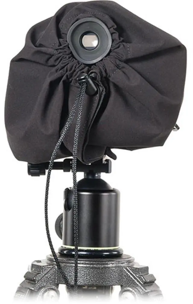 The RainCoat RS goes on quickly and easily. Its versatility through the use of the cinch straps (on Medium and Large Models) allows you to adjust the length of the cover and to keep it snug around your lens. Access the camera through the rear opening and the lens through the hook & loop bottom closure.