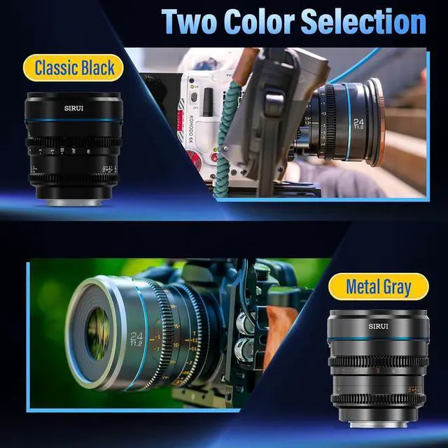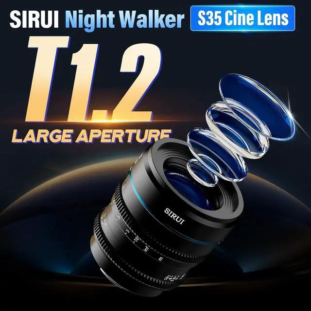 The black X-mount Night Walker 35mm T 1.2 S35 Cine Lens from Sirui offers an ultrafast T 1.2 maximum aperture that is ideal for low-light capture. Designed to cover Super35/APS-C camera sensors, this prime lens features a lightweight, compact design with high image quality, cine-style gearings, and minimal breathing. The color tone, gear position, and size are consistent across the series, providing a unified look and enabling quick lens changes when using matte boxes and other accessories.