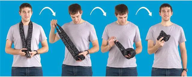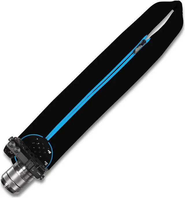The padded strap ensures even weight distribution for enhanced comfort during use. This product not only serves as a camera grip strap but also morphs into a compact and padded camera carrier. It's compatible with almost all of today's mirrorless cameras on the market, eliminating the need for a bulky camera bag.