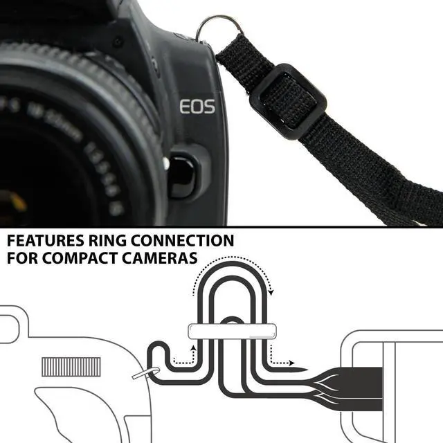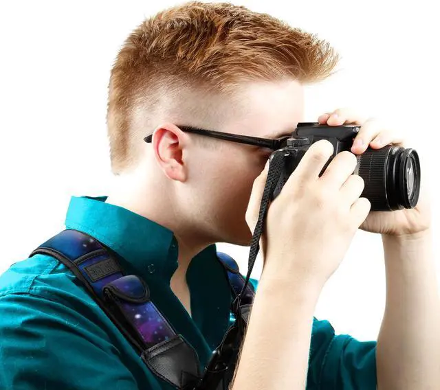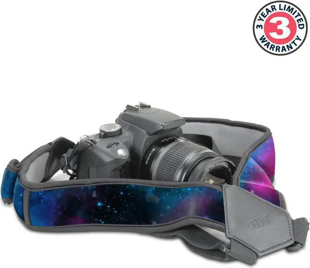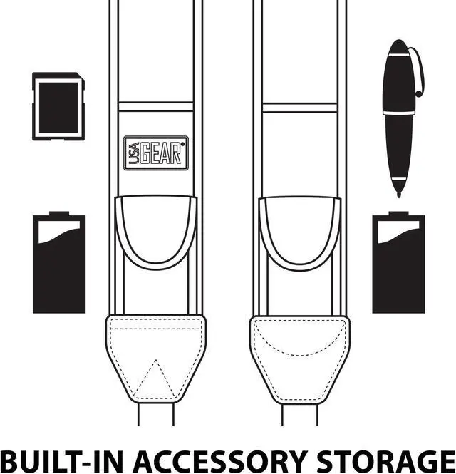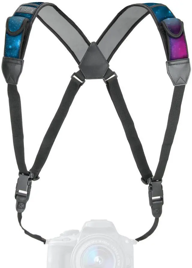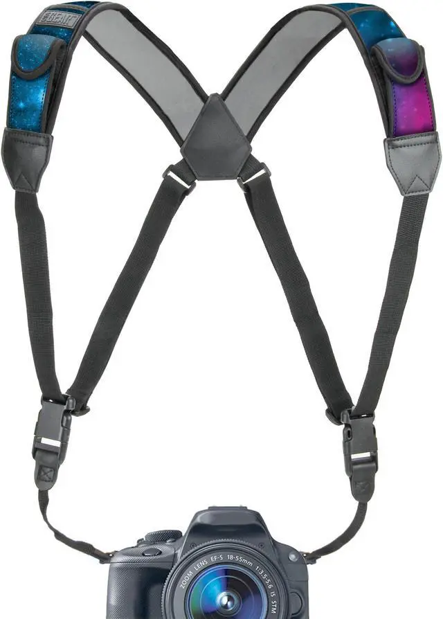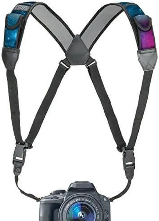 USA Gear Digital Camera Harness Strap. Comfortable Design - The harness provides even weight distribution across both shoulders so you can carry even the heaviest of cameras with ease. Using the harness strap allows you to keep your camera front and center so you can be ready to shoot anytime. The sliding strap buckles slide up and down the webbing for quick-access when you need it. Built-in Storage - The DuraNeoprene shoulder pads provide extra comfort and stretch for comfortable carrying during extended use. Built-in pockets allow you to carry your essential accessories while you’re on-the-go. Carry your memory cards , lens cloths , pens in the small pockets. Two stretchable elastic pockets can accommodate larger items like spare batteries. Easy Connection - This adjustable harness provides a comfortable fit for photographers and cameras of all sizes. The straps attach with standard 3/8 inch webbing or attach to smaller cameras using the included key rings. The quick release buckles allow you to disconnect the strap when not in use or for storage in your bag. Whether you need to be action-ready for those one-chance shots , or are simply looking for a comfortable solution on the go , this harness is an all-in-one must have! Works With DSLR , 3/4 , Point & Shoot , Mirrorless Cameras From: Canon , Nikon , Fujifilm , Kodak , Sony , Panasonic , Pentax and more