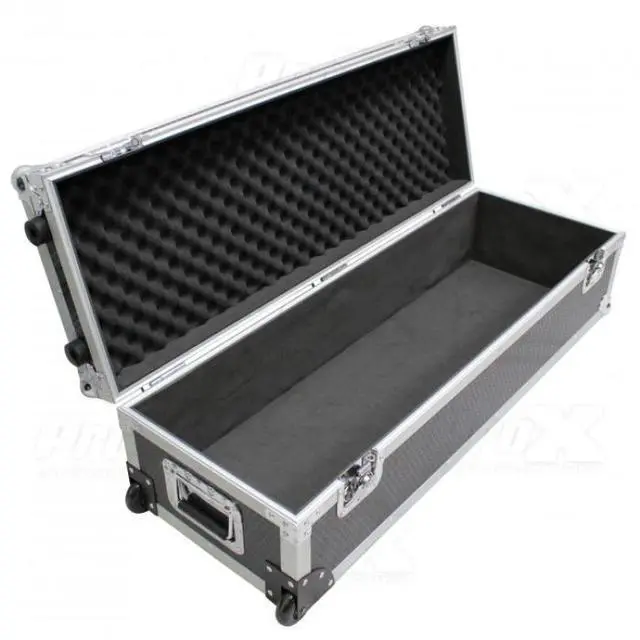 Securing the contents, the case features 2 recessed butterfly latches and a hinged top with two lid stops, complemented by nylon straps to prevent overextension. The case's vertical stance is supported by two rubber feet, while the inclusion of two low-profile wheels enables effortless mobility in an upright position. The interior ends are also foam-padded, allowing for safe transportation when the case is standing on end.