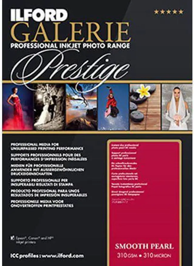 Ilford GALERIE Prestige Smooth Pearl Paper 8.5 x 11 100 Sheet Box. Professional pearl finish Instant-dry nanoporous surface Superb photographic image quality and consistency Heavyweight look and feel of a traditional photograph Excellent compatibility with all good quality pigment and dye-based inkjet printers Superb color gamut with dye ink printers